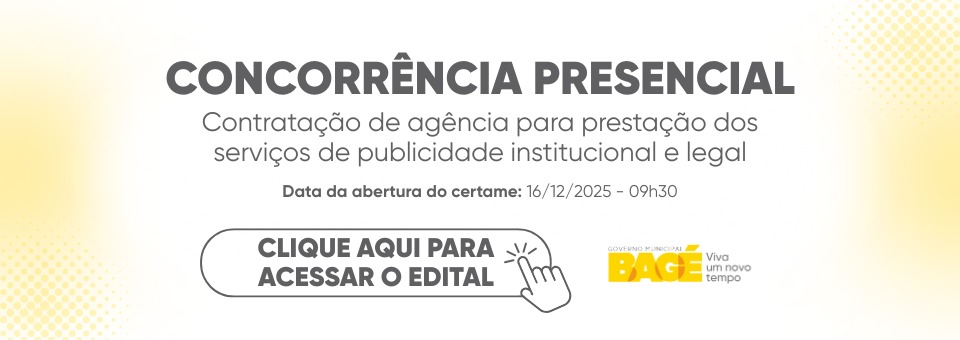URL https://prefeituraonline.bage.rs.gov.br/lic_baixaedital.php?oid_arq=926825512 Imagem Desktop Informe uma imagem para ser visualizada no desktop. Recomendado utilização uma imagem na proporcão de 3:1. Ex 1280x590px. Descrição para Desktop Caso preenchido, este valor será visualizado na versão desktop do Carrossel. Imagem Tablet Informe uma imagem para ser visualizada no Tablet. Recomendado utilização uma imagem na proporcão de 16:9. Ex 1280x720px Utilizar Título e Descrição do Desktop para Tablet sim Título para Tablet Caso preenchido, este valor será visualizado na versão tablet do Carrossel. Descrição para Tablet Caso preenchido, este valor será visualizado na versão tablet do Carrossel. Imagem Celular Informe uma imagem para ser visualizada no celular. Recomendado utilização uma imagem na proporcão de 4:3. Ex 800x600px. Utilizar Título e Descrição do Desktop para Celular sim Título para Celular Caso preenchido, este valor será visualizado na versão celular do Carrossel. Descrição para Celular Caso preenchido, este valor será visualizado na versão celular do Carrossel. Configurações Nome curto Esse nome será exibido na URL. concorrencia-presencial-servicos-de-publicidade-institucional-e-legal