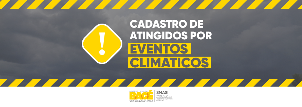 URL https://www.bage.rs.gov.br/smasi_cadastro_atingidos_eventos_climaticos/cadastro-de-pessoas-atingidas-por-eventos-climaticos-2023-2024 Imagem Desktop Informe uma imagem para ser visualizada no desktop. Recomendado utilização uma imagem na proporcão de 3:1. Ex 1280x590px. Descrição para Desktop Caso preenchido, este valor será visualizado na versão desktop do Carrossel. Imagem Tablet Informe uma imagem para ser visualizada no Tablet. Recomendado utilização uma imagem na proporcão de 16:9. Ex 1280x720px Sem imagem Utilizar Título e Descrição do Desktop para Tablet não Título para Tablet Caso preenchido, este valor será visualizado na versão tablet do Carrossel. Descrição para Tablet Caso preenchido, este valor será visualizado na versão tablet do Carrossel. Imagem Celular Informe uma imagem para ser visualizada no celular. Recomendado utilização uma imagem na proporcão de 4:3. Ex 800x600px. Sem imagem Utilizar Título e Descrição do Desktop para Celular não Título para Celular Caso preenchido, este valor será visualizado na versão celular do Carrossel. Descrição para Celular Caso preenchido, este valor será visualizado na versão celular do Carrossel. Configurações Nome curto Esse nome será exibido na URL. cadastro-de-pessoas-atingidas-por-eventos-climaticos-2023-2024
